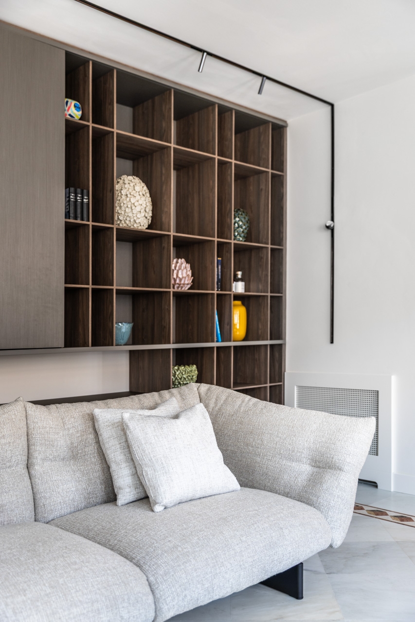 Ristrutturazione che valorizza la pavimentazione esistente in pregiato marmo, preservandone l’eleganza e il carattere. Arredi e boiserie sono stati progettati su misura, così come la ringhiera della scala in marmo e la nuova scala che conduce all’altana, pensata per conferire leggerezza e armonia agli spazi.